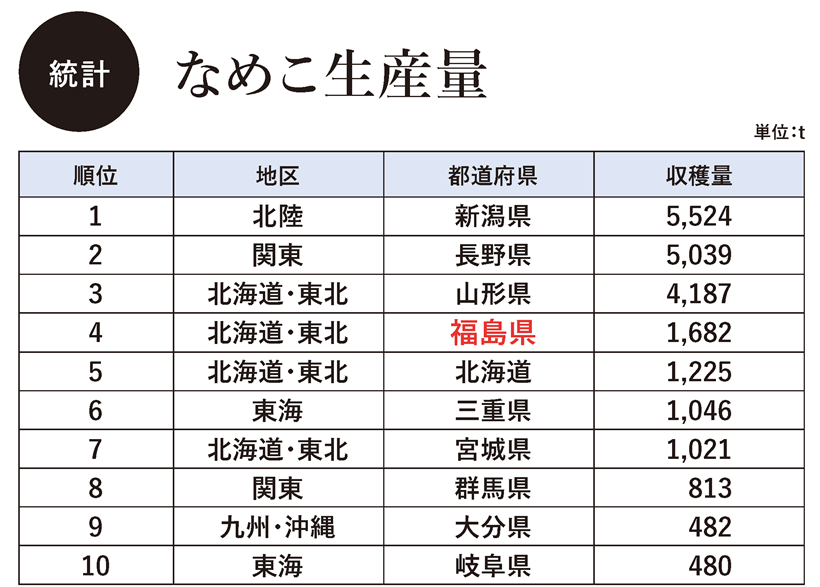 福島県は2023年なめこの生産量全国第4位。2005年に2,000tを超えた生産量が、2011年の原発事故による風評被害などで生産量が落ち込み、その後一度はV字回復を果たしたものの、現在は1,600t程度で推移している。